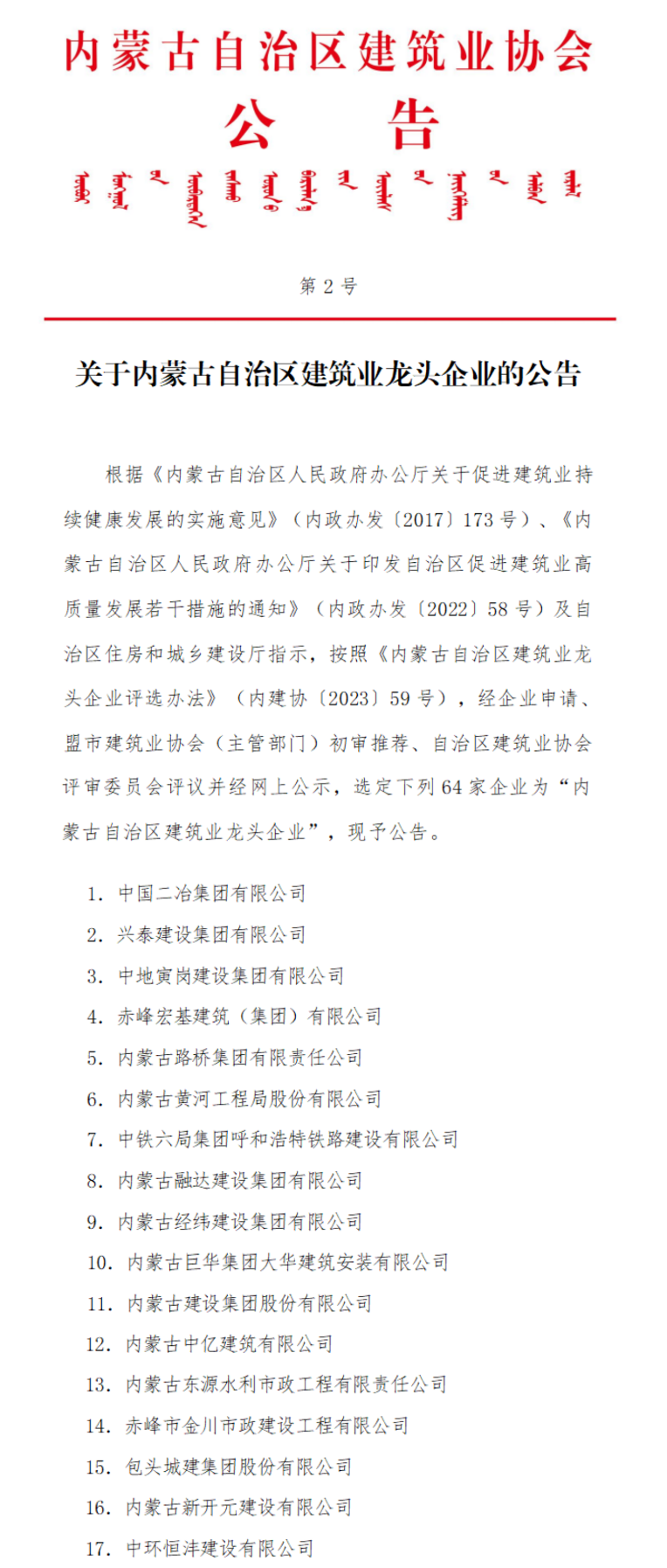 根據(jù)《內(nèi)蒙古自治區(qū)人民政府辦公廳關(guān)于促進(jìn)建筑業(yè)持續(xù)健康發(fā)展的實(shí)施意見(jiàn)》(內(nèi)政辦發(fā)(2017)173號(hào))、《內(nèi)蒙古自治區(qū)人民政府辦公廳關(guān)于印發(fā)自治區(qū)促進(jìn)建筑業(yè)高質(zhì)量發(fā)展若千措施的通知》(內(nèi)政辦發(fā)(2022)58號(hào))及自治區(qū)住房和城鄉(xiāng)建設(shè)廳指示,按照《內(nèi)蒙古自治區(qū)建筑業(yè)龍頭企業(yè)評(píng)選辦法》(內(nèi)建協(xié)(2023)59號(hào)),經(jīng)企業(yè)申請(qǐng)、盟市建筑業(yè)協(xié)會(huì)(主管部門(mén))初審?fù)扑]、自治區(qū)建筑業(yè)協(xié)會(huì)評(píng)審委員會(huì)評(píng)議并經(jīng)網(wǎng)上公示,中環(huán)恒灃建設(shè)有限公司、中國(guó)二治集團(tuán)有限公司、興泰建設(shè)集團(tuán)有限公司、中地寅崗建設(shè)集團(tuán)有限公司等64家企業(yè)被評(píng)為“內(nèi)蒙古自治區(qū)建筑業(yè)龍頭企業(yè)”,現(xiàn)子公告。